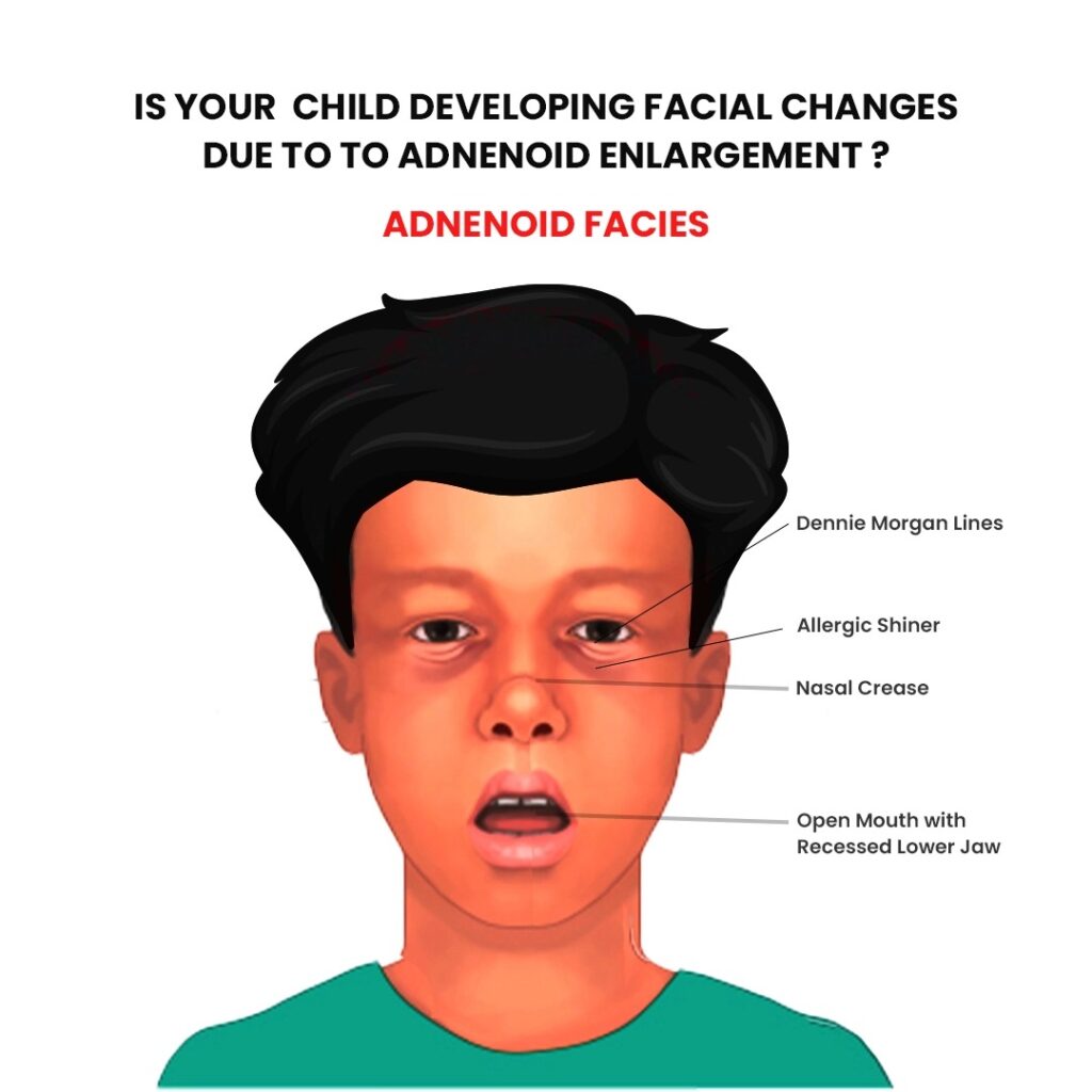 - Adenoid Facies: Chronic mouth breathing due to adenoid enlargement can result in characteristic facial changes, including: